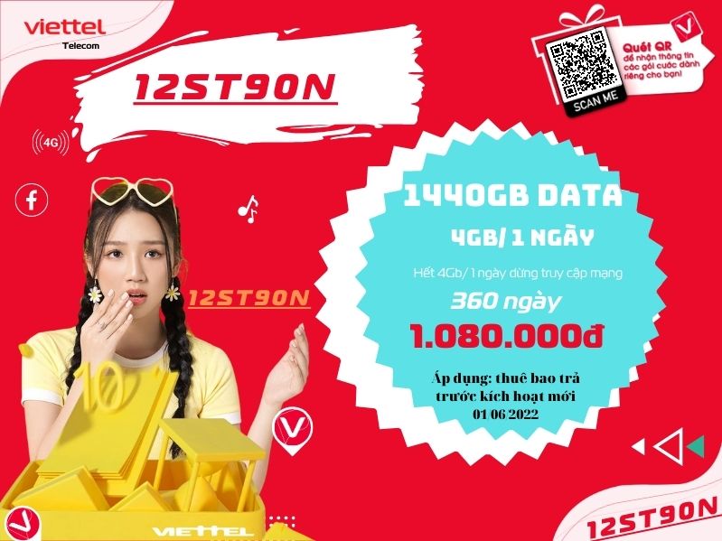Đăng ký 12ST90N Viettel chỉ với mức giá là 1.080.000đ sử dụng trong 360 ngày (+ 180 ngày khuyến mại) . Bạn có ngay 1440Gb (+ 240Gb khuyến mại) data 4g tốc độ cao truy cập mạng internet trên điện thoại di động của mình. Mỗi ngày sử dụng 4Gb data tốc độ cao, hết 4Gb data dùng truy cập.