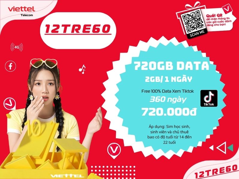 Nội dùng bài này chúng tôi tổng hợp gửi đến bạn gói 12TRE60 của Viettel để bạn tìm hiểu và đăng ký sử dụng ngay khi có nhu cầu. Bởi đây là gói cước cực kỳ ưu đãi của nhà mạng Viettel mới cho ra mắt với nhiều khuyến mại dành cho các bạn học sinh, sinh viên và giới trẻ hiện nay có độ tuổi từ 14 đến 22 tuổi.