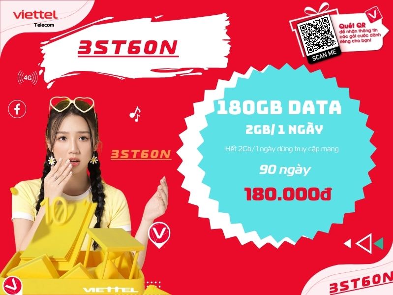 Đăng ký 3ST60N Viettel chỉ với mức giá vô cùng hợp lý là 180k bạn nhận ngay ưu đãi 180Gb data tốc độ cao sử dụng trong 3 tháng, sử dụng 2Gb data 1 ngày. Gói 3ST60N của Viettel hiện nay đang là một trong các gói 4G khuyến mại của Viettel được đông đảo khách hàng quan tâm tìm kiếm và đăng ký sử dụng nhiều nhất, bởi mức ưu đãi vô cùng lớn của gói cước này sẽ đáp ứng được hầu hết nhu cầu sử dụng dung lượng data 4G tốc độ cao của người dụng mạng Viettel hiện nay.
