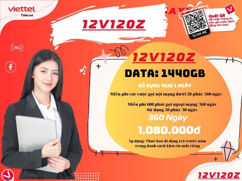 Đăng ký gói 12V120Z Viettel nhận ngay ưu đãi siêu khủng chỉ với 1.080k sử dụng trong 360 ngày. Bạn nhận ngay 1440Gb data tốc độ cao trong 360 ngày (4Gb/ ngày). Miễn phí tất cả các cuộc gọi nội mạng < 20 phút + miễn phí 600 phút gọi ngoại mạng ( 50 phút/ 30 ngày) sử dụng trong 360 ngày kể từ ngày đăng ký. Đây là một mức ưu đãi vô cùng lớn dành cho khách hàng sử dụng sim di động Viettel kích hoạt mới kể từ ngày 01/07/2021.