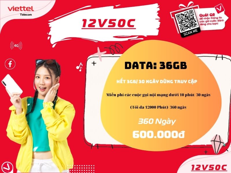 Đăng ký 12V50C của Viettel chỉ với mức giá là 600.000đ cho 12 tháng sử dụng liên tục. Bạn được miễn phí (3Gb data 4G tốc độ cao của Viettel/ 30 ngày)/ 12 chu kỳ truy cập mạng internet trên điện thoại di động của mình. Ngoài ra bạn được miễn phí tất cả các cuộc gọi nội mạng Viettel có thời lượng dưới 10 phút 1 cuộc. Tối đa bạn có thể gọi tới (1000 phút trong 30 ngày)/ 12 chu kỳ. Đây quả là một mức ưu đãi vô cùng hấp dẫn dành cho thuê bao di động của bạn đăng ký sử dụng.