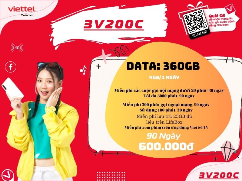 Đăng ký 3V200C Viettel chỉ với mức giá là 600.000đ cho 3 tháng sử dụng liên tục. Bạn có ngay 360Gb data 4G tốc độ cao truy cập mạng internet trên điện thoại di động(sử dụng 4Gb/ngày). Miễn phí lưu trữ 25GB dữ liệu trên LifeBox, Miễn phí xem phim trên ứng dụng Viettel TV trên điện thoại di động. Ngoài ra bạn được miễn phí tất cả các cuộc gọi nội mạng Viettel có thời lượng dưới 20 phút 1 cuộc, tối đa bạn có thể gọi tới (1000 phút trong 30 ngày)/ 90 ngày. Đồng thời bạn được miễn phí 300 phút gọi ngoại mạng Viettel trong 90 ngày. Đây quả là một mức ưu đãi vô cùng hấp dẫn dành cho thuê bao di động của bạn đăng ký sử dụng.