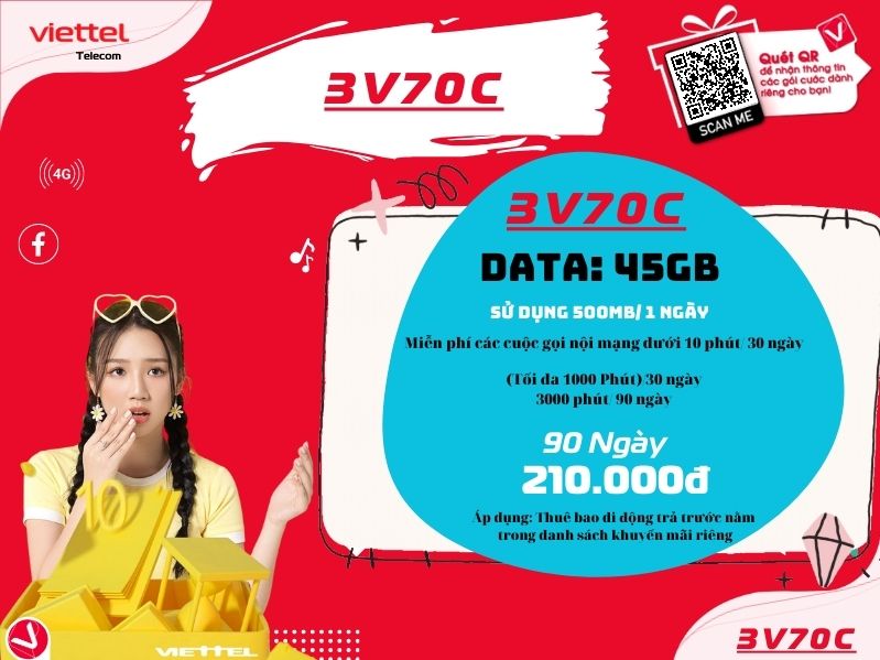 Các bạn thân mến. Hiện nay trên thị trường Việt Nam, nhu cầu sử dụng điện thoại di động của mỗi người dân chủ yếu là nghe, gọi, và sử dụng data 4G tốc độ cao truy cập mạng internet. Hiểu được nhu cầu sử dụng ngay càng ra tăng của khách hàng. Viettel luôn cho ra đời các gói khuyến mãi Viettel để đáp ứng nhu cầu sử dụng nhiều mà lại tiết kiệm chi phí sử dụng. Gói 3V70C của Viettel ra đời giúp bạn thỏa mái vừa gọi vừa sử dụng data truy cập mạng internet tren điện thoại di động. Vậy thì còn gì tuyệt vời hơn phải không nào các bạn?