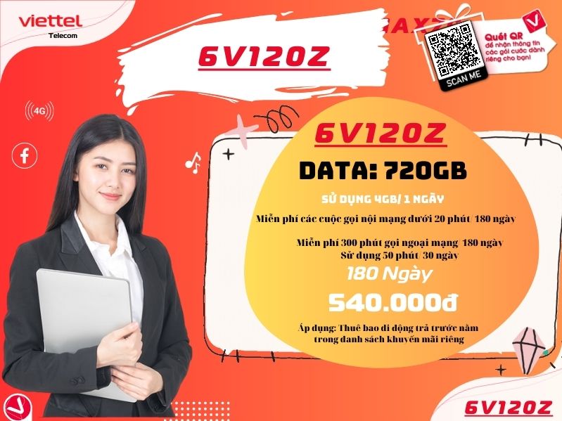 Đăng ký gói 6V120Z Viettel nhận ngay ưu đãi siêu khủng chỉ với 540k sử dụng trong 180 ngày. Bạn nhận ngay 720Gb data tốc độ cao trong 180 ngày (4Gb/ ngày). Miễn phí tất cả các cuộc gọi nội mạng < 20 phút + miễn phí 300 phút gọi ngoại mạng ( 50 phút/ 30 ngày) sử dụng trong 180 ngày kể từ ngày đăng ký. Đây là một mức ưu đãi vô cùng lớn dành cho khách hàng sử dụng sim di động Viettel kích hoạt mới kể từ ngày 01/07/2021.