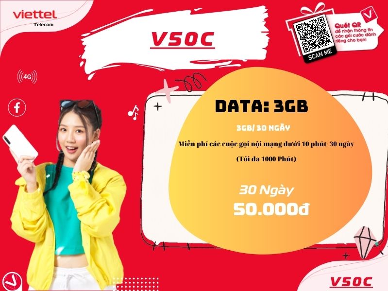 Các bạn thân mến. Hiện nay trên thị trường Việt Nam, nhu cầu sử dụng điện thoại di động của mỗi người dân chủ yêu là nghe, gọi, và sử dụng data 4G tốc độ cao truy cập mạng internet. Hiểu được nhu cầu sử dụng ngay càng ra tăng của khách hàng. Viettel luôn cho ra đời các gói khuyến mãi có mức giá và ưu đãi khác nhau để khách hàng thỏa sức lựa chọn cho mình gói cước phù hợp nhất. Gói V50C sẽ đáp ứng hết các nhu cầu sử dụng trên điện thoại di động của bạn chỉ với mức giá 50k 1 tháng thật tuyệt vời đúng không nào?